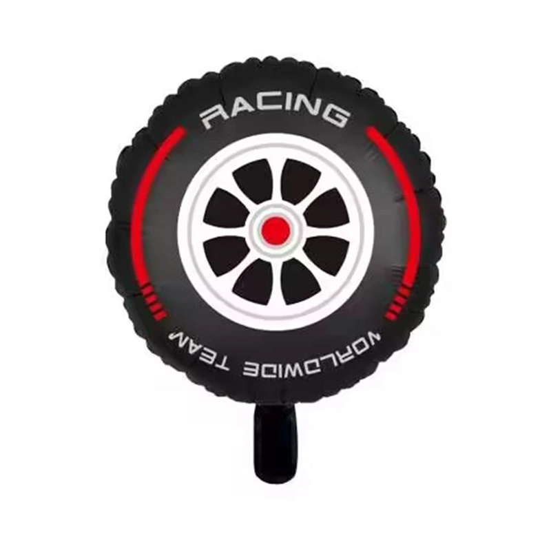 Balon foliowy przedstawia stylizowane koło wyścigowe z białymi szprychami i czerwonym środkiem. Na górze balonu znajduje się napis "RACING", a na dole "WORLDWIDE TEAM". Balon jest czarny z czerwonymi akcentami, co nadaje mu dynamiczny i sportowy wygląd. Idealny na imprezy tematyczne związane z wyścigami samochodowymi lub jako dekoracja dla fanów motoryzacji.