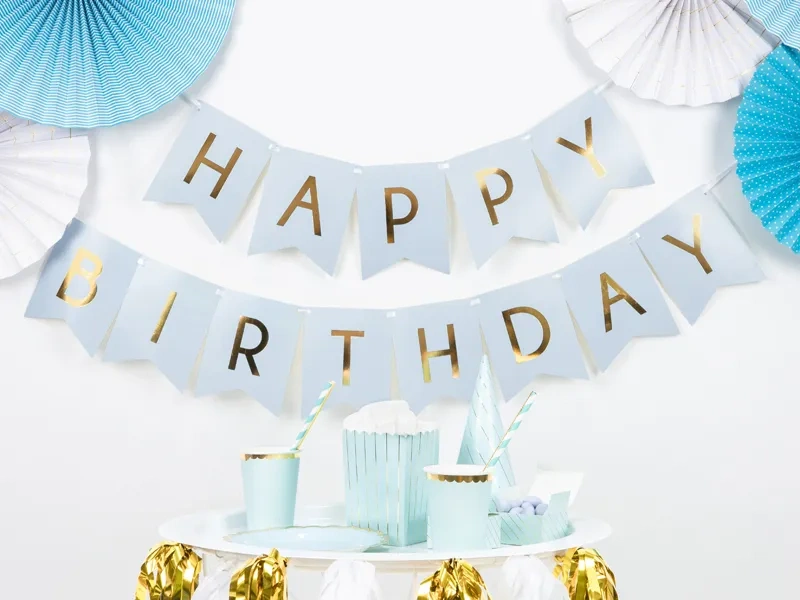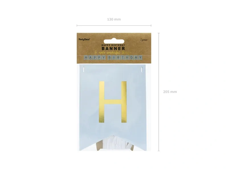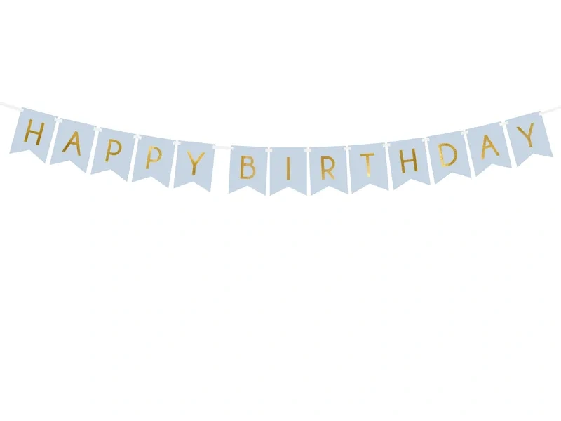 Baner w kolorze jasnoniebieskim ze złotym napisem Happy Birthday, do samodzielnego złożenia, zestaw zawiera literki i ok. 2,5 m białej tasiemki, wymiary po złożeniu: wysokość ok. 15 cm, długość ok. 175 cm.
