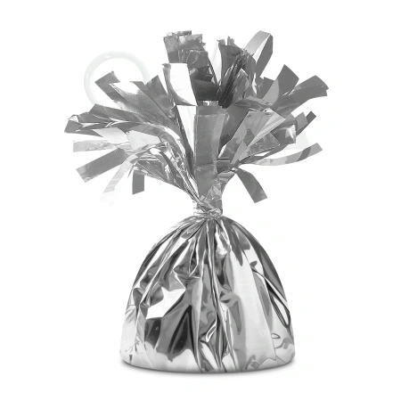 Ciężarek do balonów owinięty folią w kolorze srebrnym, wysokość ok. 12 cm, waga ok. 140 g.