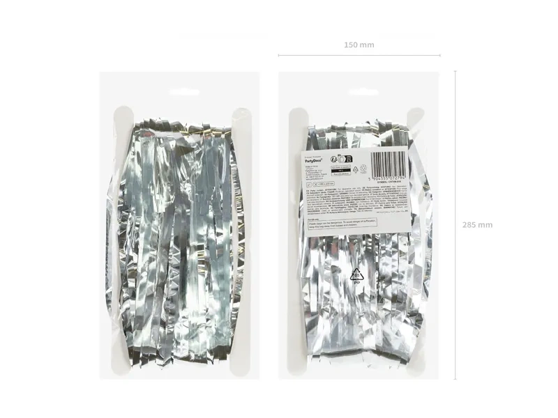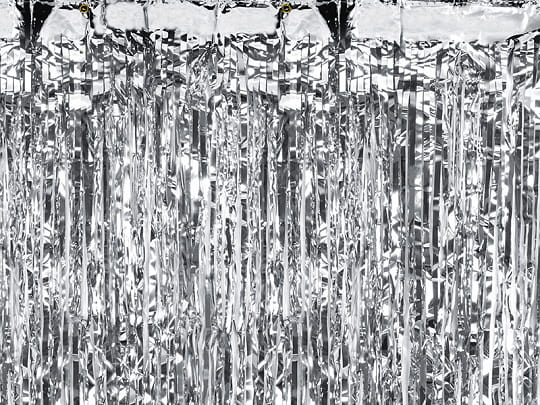 - Kurtyna Party metalizowana w kolorze srebrnym, szerokość ok. 100 cm, wysokość ok. 200 cm. Wykonana z folii o grubości 20 µm.