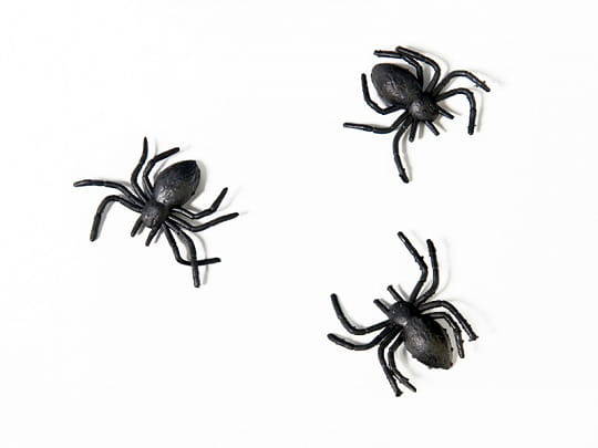 - Małe pająki plastikowe w kolorze czarnym. Przydadzą się jako element dekoracji stołu, na dynię lub na pajęczynę. Niezbędny detal halloweenowej imprezy. Wymiary 3 cm x 3 cm. W jednym opakowaniu jest 10 sztuk.