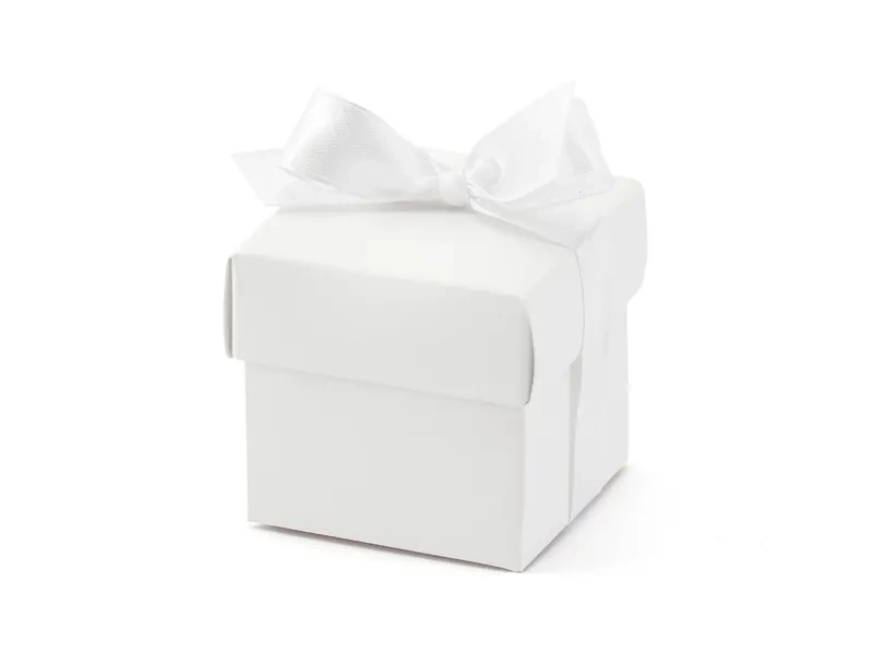 Pudełeczka wykonane z papieru w kolorze białym, z satynową tasiemką, idealne na prezenciki dla gości, wymiary po złożeniu 5,2x5,2x5,2 centymetra. (1 op. / 10 szt.)