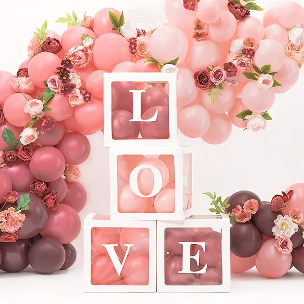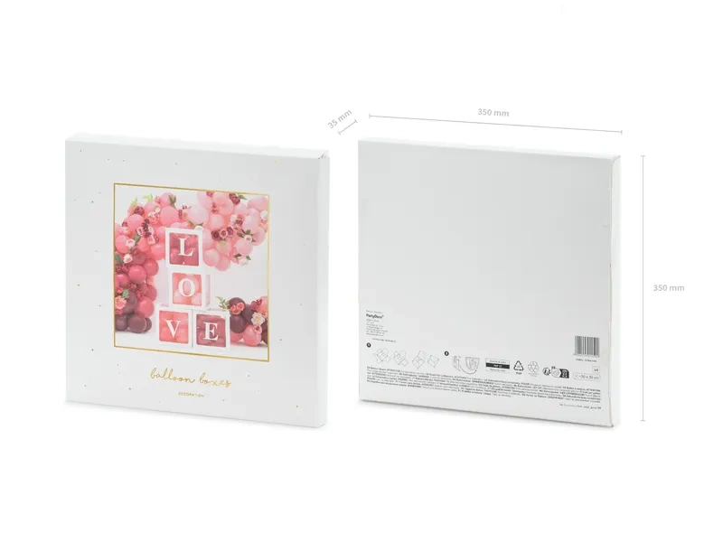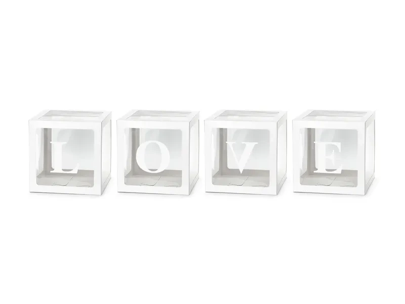 - Zestaw 4 pudełek na balony oraz naklejane literki LOVE w kolorze białym. Pudełka o wymiarach 30 x 30 cm. Produkt do samodzielnego złożenia. (1 op. / 4 szt.)