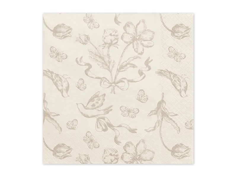 - Papierowe serwetki w kolorze beżowym z ciemnobeżowymi kwiatami. Wymiary po rozłożeniu ok. 33 x 33 cm, wymiary po złożeniu ok. 16.5 x 16.5 cm. Jedno opakowanie zawiera 12 sztuk