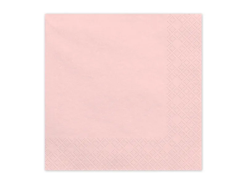 Serwetki trójwarstwowe w kolorze jasnego różu. Wymiary ok. 33 x 33 cm. Jedno opakowanie zawiera 20 sztuk.