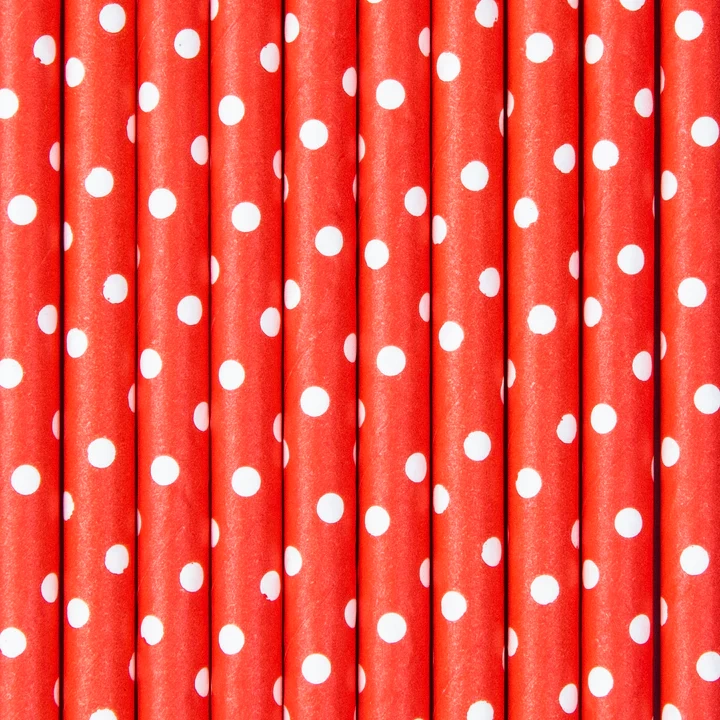 - Słomki papierowe, czerwone w białe kropki, długość około 20 centymetrów. Jedno opakowanie zawiera 10 sztuk.