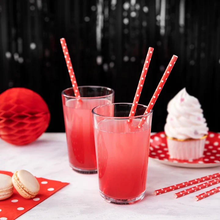 Słomki papierowe, czerwone w białe kropki, długość około 20 centymetrów. Jedno opakowanie zawiera 10 sztuk.Szerokość towaru w centymetrachWięcejSzerokość towaru w centymetrach