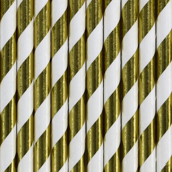 - Słomki papierowe w kolorze złotym z białymi ukośnymi paskami. Papierowe słomki to nieodłączny element na każdym przyjęciu. Są piękne, a przy tym niezwykle funkcjonalne! Długość około 19,5 centymetra. Jedno opakowanie zawiera 10 sztuk.