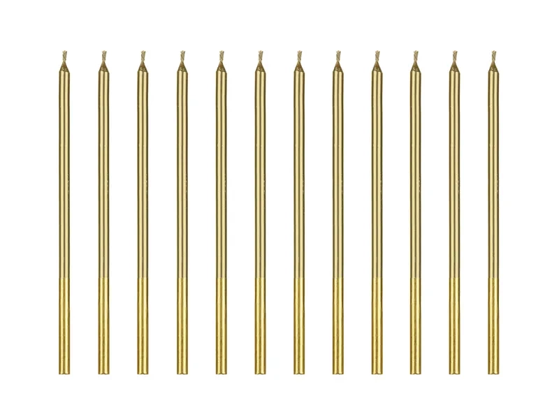 - Świeczki urodzinowe gładkie w kolorze złotym, wysokość ok. 14 cm. Zestaw zawiera 12 świeczek.
