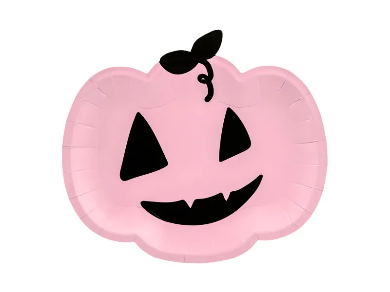 - Talerzyki papierowe Dynia w kolorze różowym z czarnym nadrukiem, wymiary ok. 25 x 22 cm.