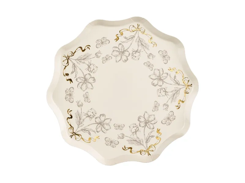 - Papierowe, beżowe talerzyki z ciemnobeżowymi kwiatami i złotym błyszczącym nadrukiem. Średnica około 20 cm.