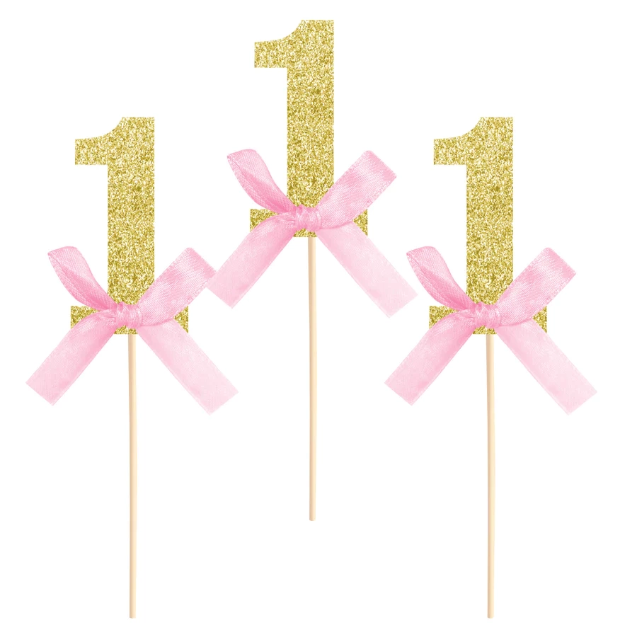 Toppery na tort cyfra 1 różowa kokarda 6szt.