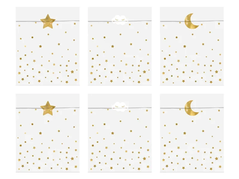 Torebki na słodycze Little Star wykonane z papieru ze złotym metalizowanym wzorem, zestaw zawiera 6 torebek i 6 naklejek, wymiary po złożeniu ok. 13 x 14cm.
