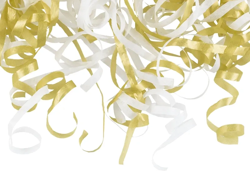 Tuba manualna z serpentynami o długości ok. 6 m w kolorze białym i złotym, długość ok. 25 cm.