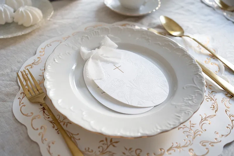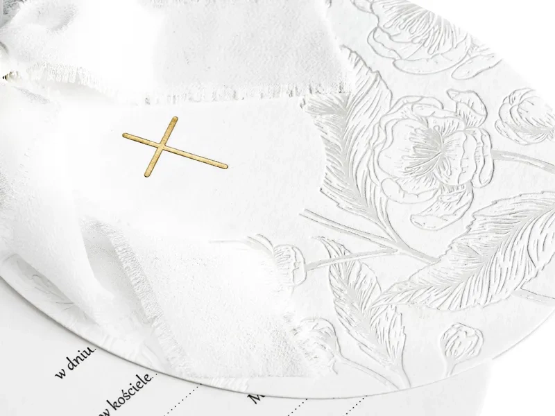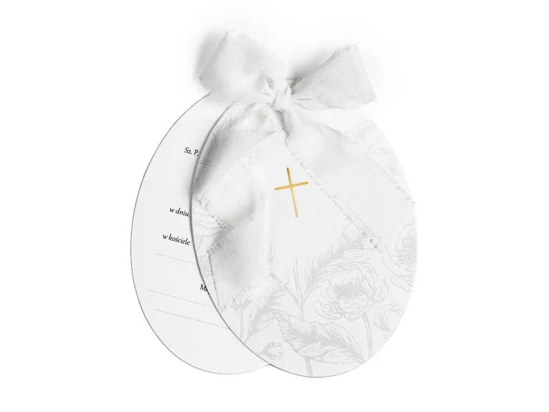 Zaproszenia komunijne w kolorze białym ze złotym krzyżem i perłowym nadrukiem z kwiatami. Zaproszenie składa się z dwóch kart, w zestawie znajdują się koperty oraz biała, szyfonowa wstążka o długości 3 metrów do samodzielnego pocięcia i związania obu części zaproszenia. Napisy w języku polskim. Rozmiar zaproszenia 11x14,8 cm