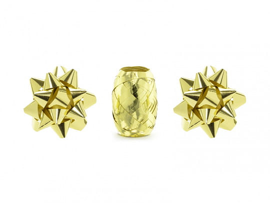 - Wstążka i 2 rozety plastikowe metalizowane w kolorze złotym. Idealny zestaw do przystrojenia prezentu dla bliskiej osoby :) Wymiary wstążki: szerokość ok. 5 mm, długość ok. 10 m, średnica rozety ok. 7 cm.